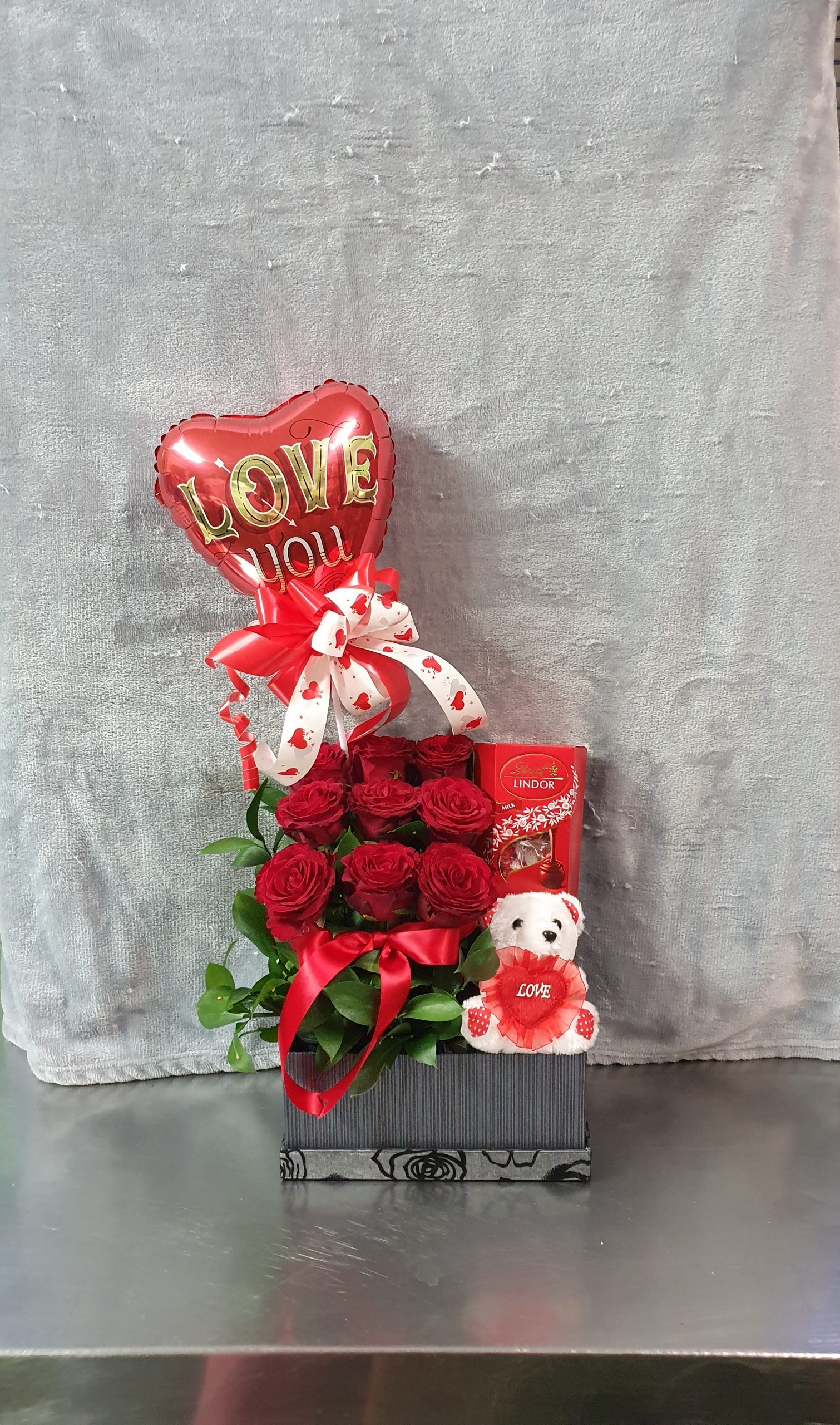 Gift box with 9 red roses, 125 g Lindt, Teddy and balloon