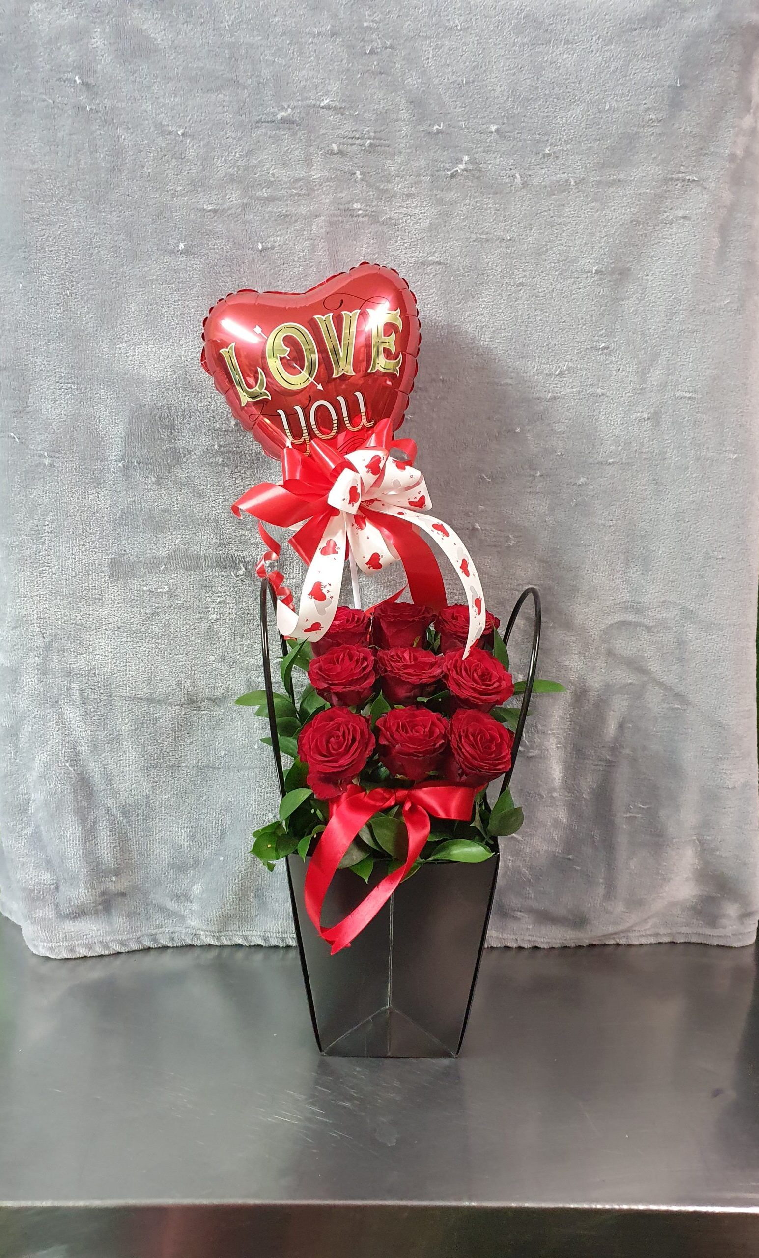 Bnox with 4 red roses, 5x Ferrero Rochers and balloon