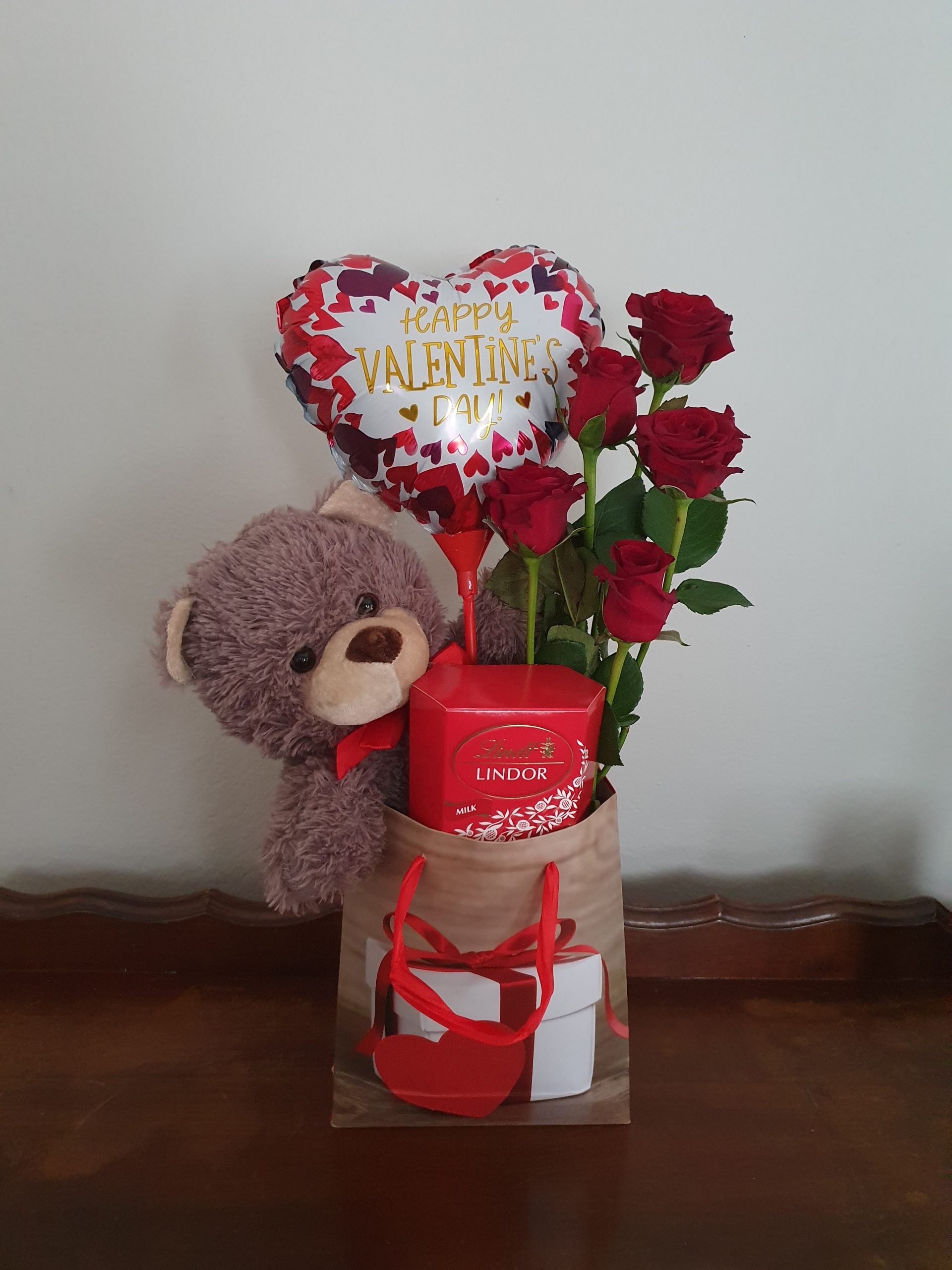 Gift bag, 5x Red roses, 200g Lindt choc, Teddy & Balloon