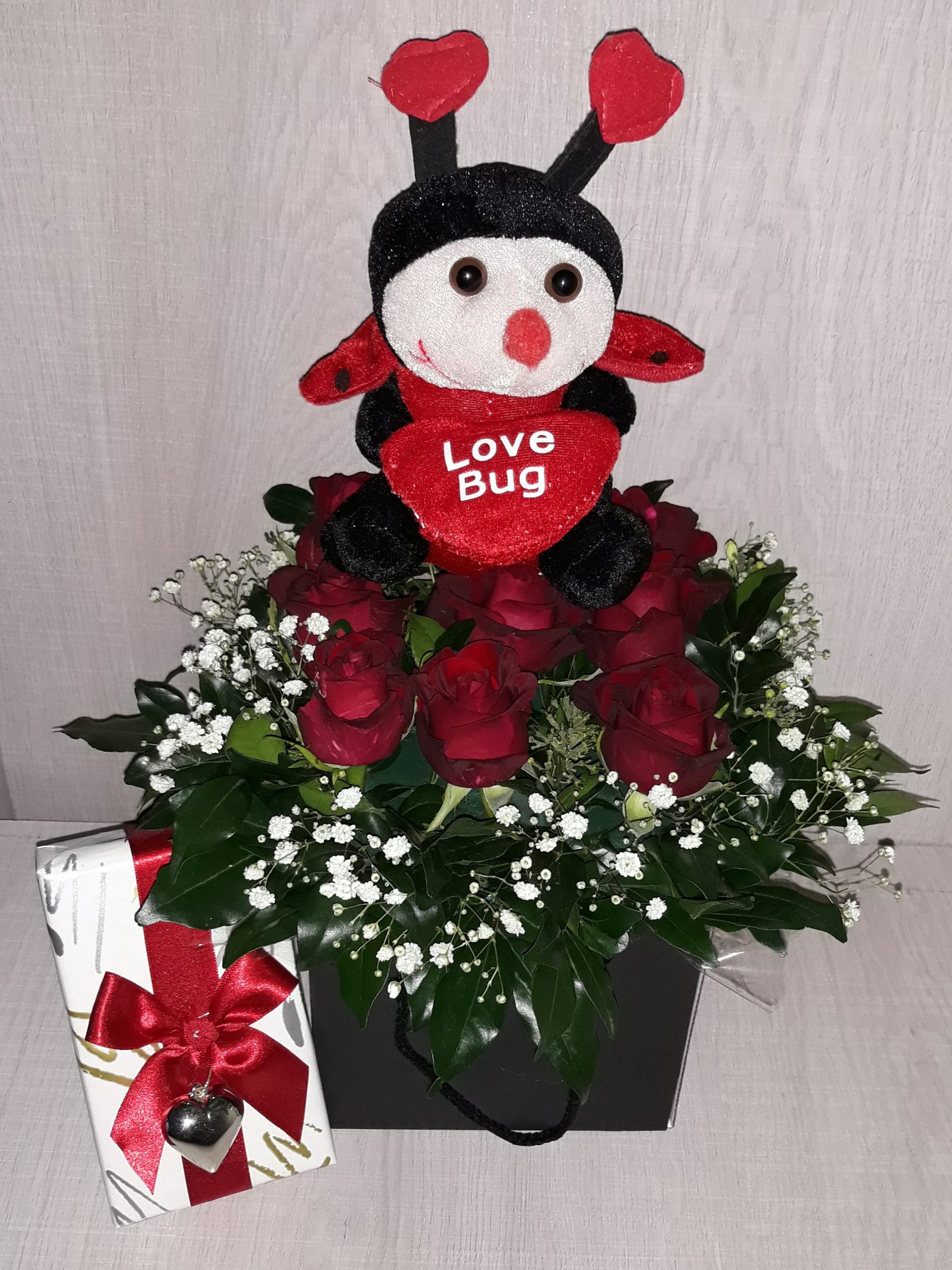 Valentin's box with 9 red roses, teddy and box chocs quantity